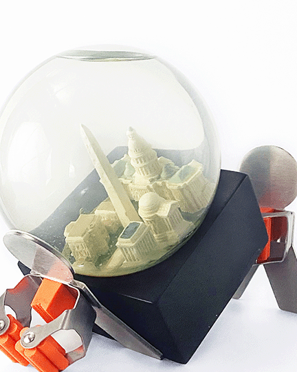 Wood toy sign, carved coal figurine, steel and plastic mop holders, Washington DC snow-globe.